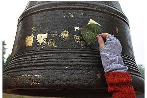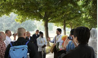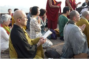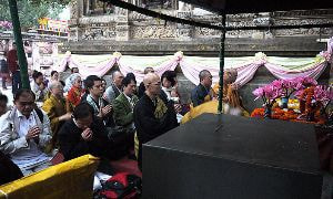 早朝5時半、ホテルのオーナー、Sanjayさんの案内で大塔に向かう。大塔は闇の中にその姿をたたえていた。5時に開門となるのだが、それより早い時間から大勢の僧俗が押し寄せ、大塔の周りでは五体投地が繰り返されている。そして夜明けとともに、いろんな国の方々が、それぞれの場所を確保して、お経を唱え始める。我々はまず大塔に参拝して、Sanjay氏の計らいで皆がそろって菩提樹の下で誦経することが出来た。