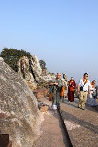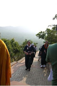 ここからはほぼ1㎞の昇りで、途中で休息を取りながら、みんな頑張って山頂に到着。眼下に広がるインドの大自然を眺めながら、皆で読経を行う。般若心経3巻を上げながら、お釈迦様が説法を行った事を思いつつ、三拝をひとり、ひとり、こころを込めて、それぞれの思いを込めてお勤めする。